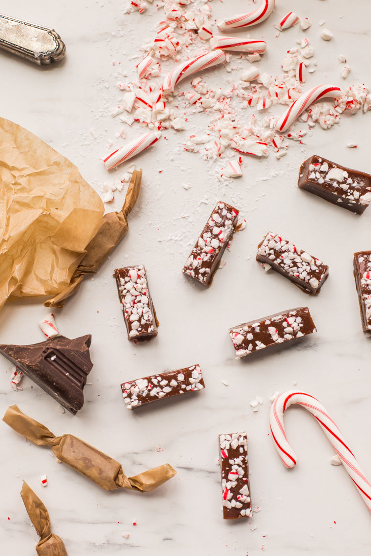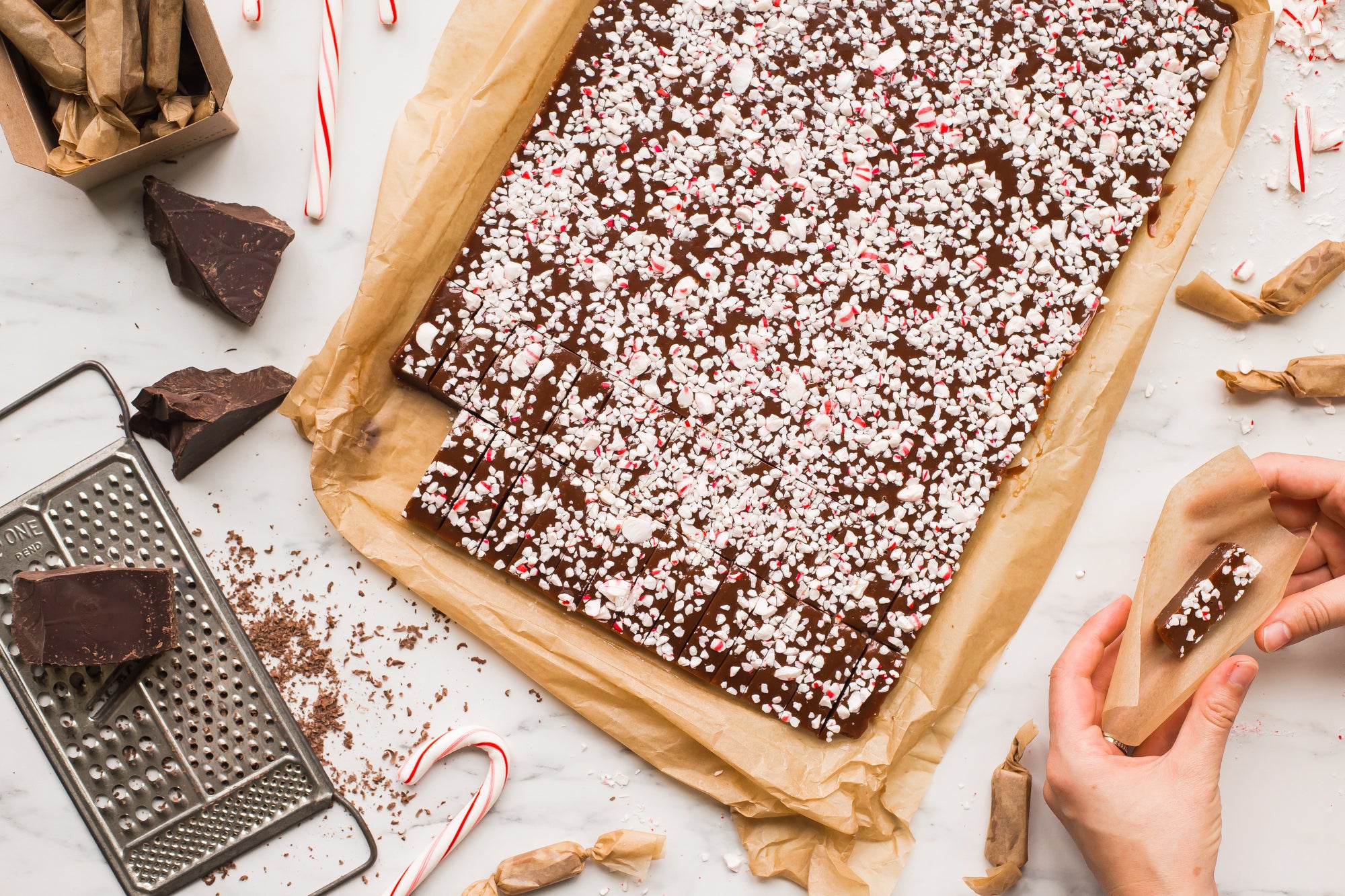 Back Story.  Available only during the holidays, we've combined our handcrafted caramels with dark chocolate, marshmallow, a touch of molasses, crunchy pieces of old fashioned candy cane and a light sprinkling of sea salt.